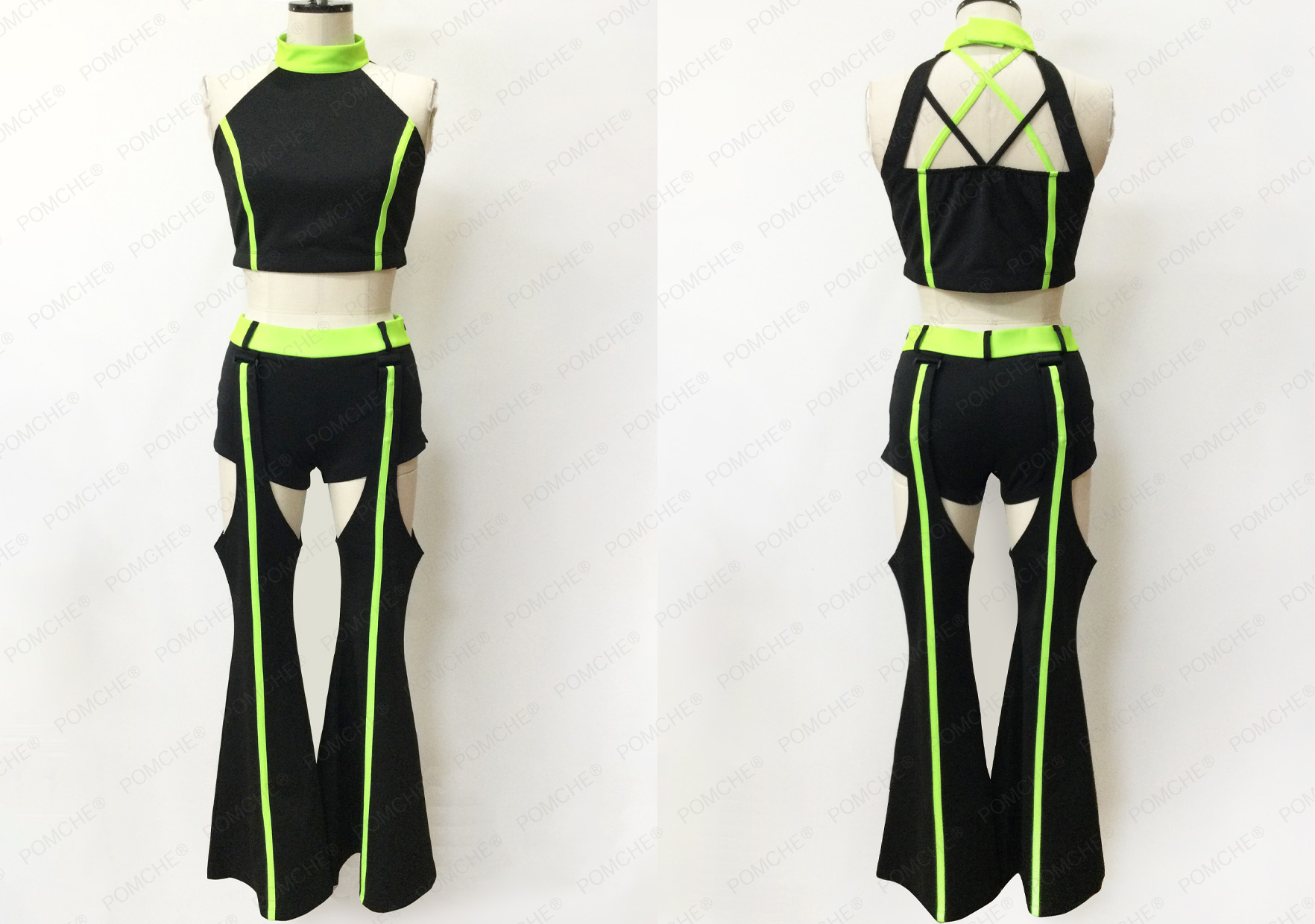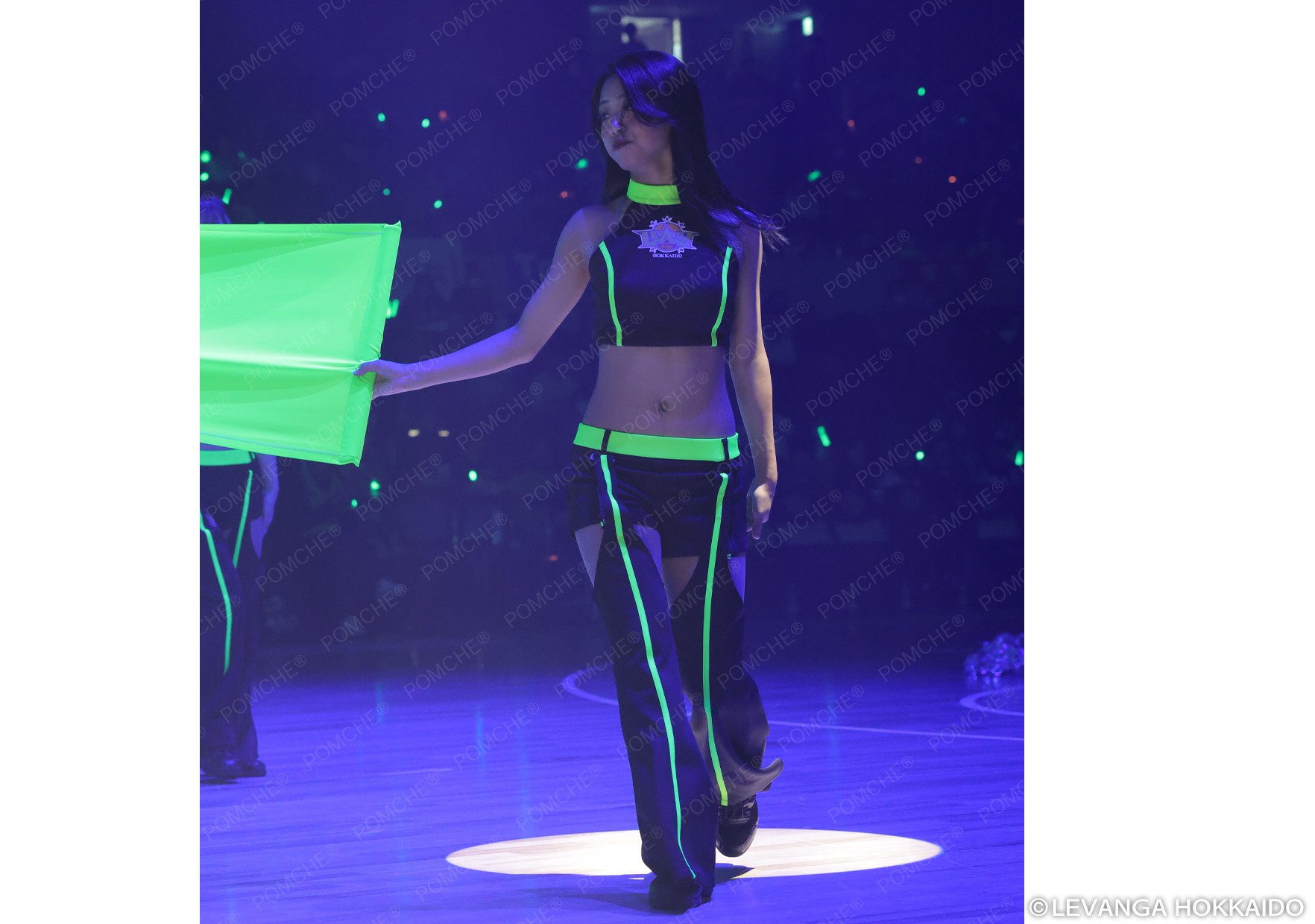 お腹を見せる丈感のノースリーブトップス&ショートパンツにロングレッグカバーをプラスした、トップチームらしい大胆なデザインのお衣装。ブラックをメインに、レバンガ北海道のチームカラー・ネオングリーンを合わせた未来感のある配色で、トップスから足元まで繋がる2本の縦ラインがとても印象的に仕上っています。