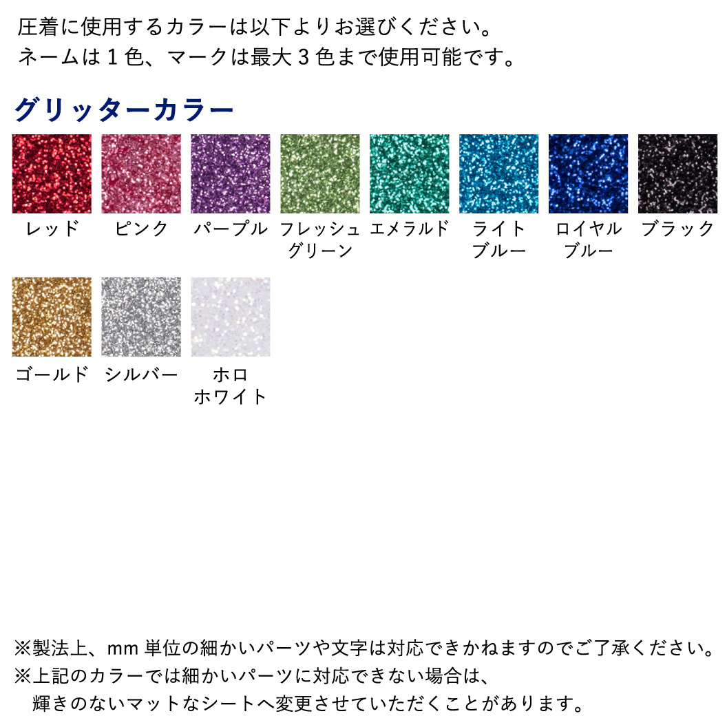 別途デザイン代4,400円(1デザインあたり・初回のみ)、色数に応じたグリッター圧着加工代が必要となります。
