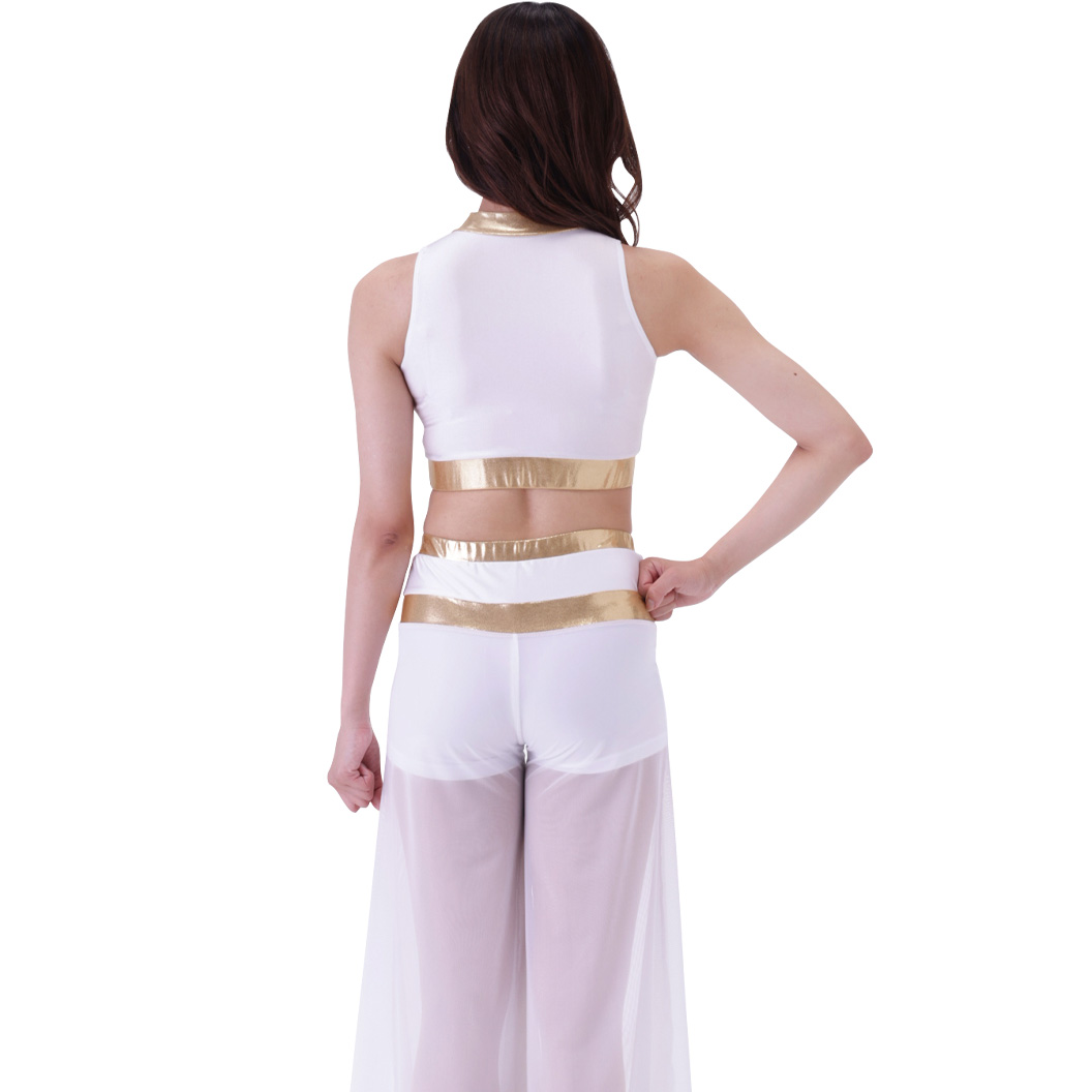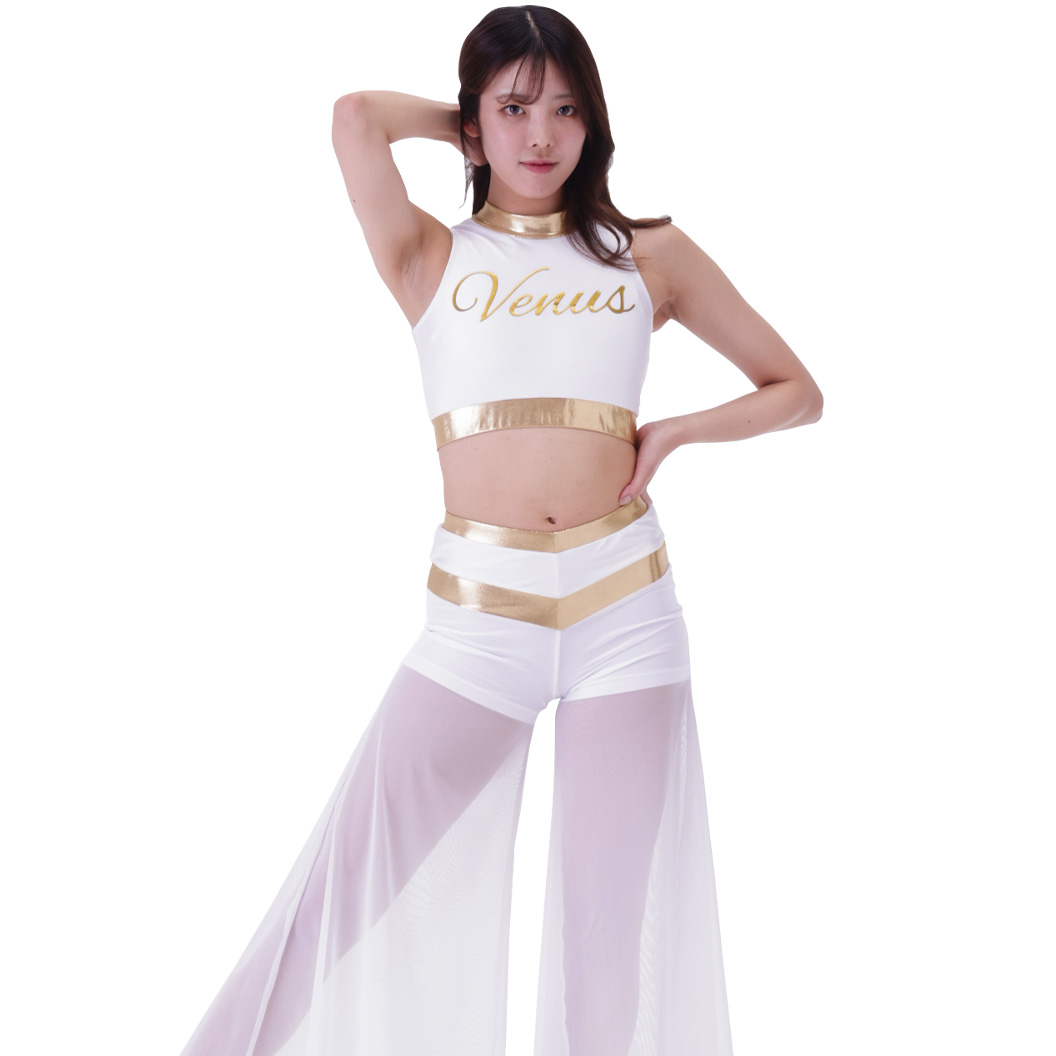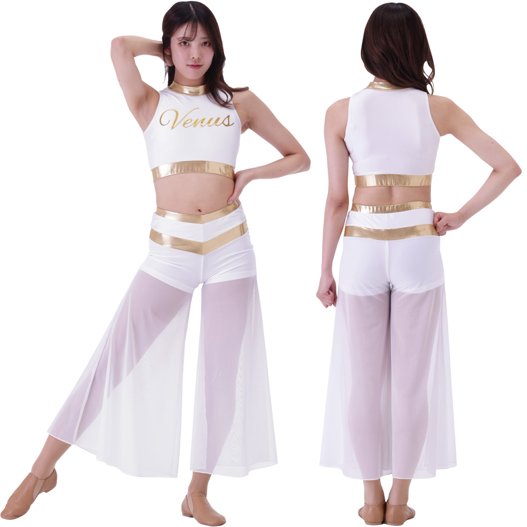 白をメインにゴールドが映える人気の配色。シースルー素材のパワーネットをパンツに使用して軽やかな印象に仕上げています。