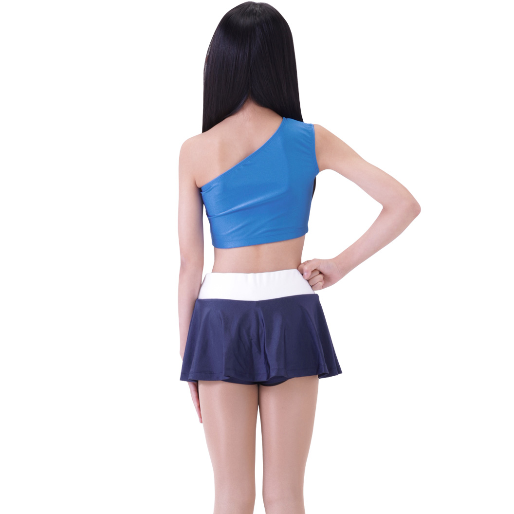 ワンショルダーのショート丈トップスL-TOP-6、フレア感のあるミニスカートL-SK-72を組み合わせました。