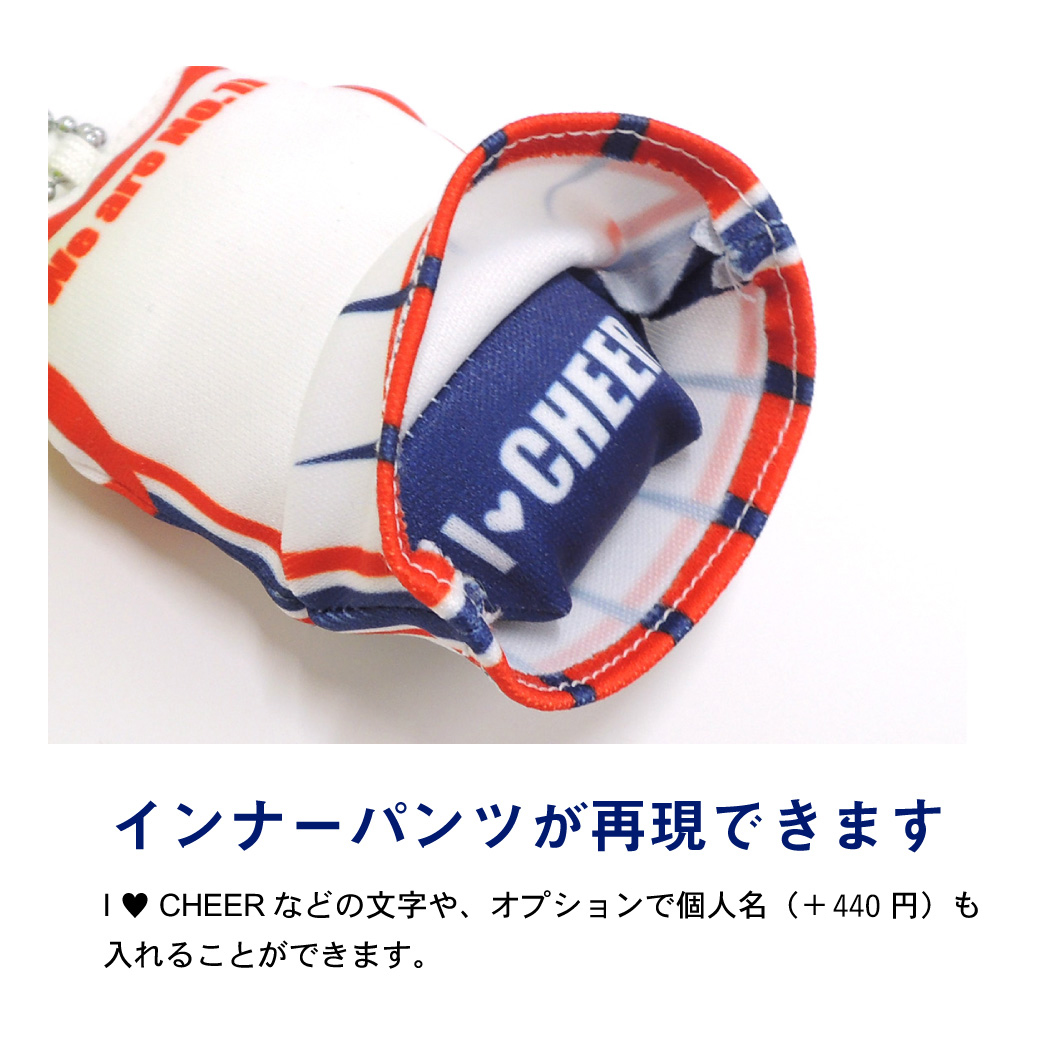 チアユニフォームを再現したデザインで作製できるボールチェーン付きのマスコット。個人名を入れたり、ポンポンを付けたりすることもできます。