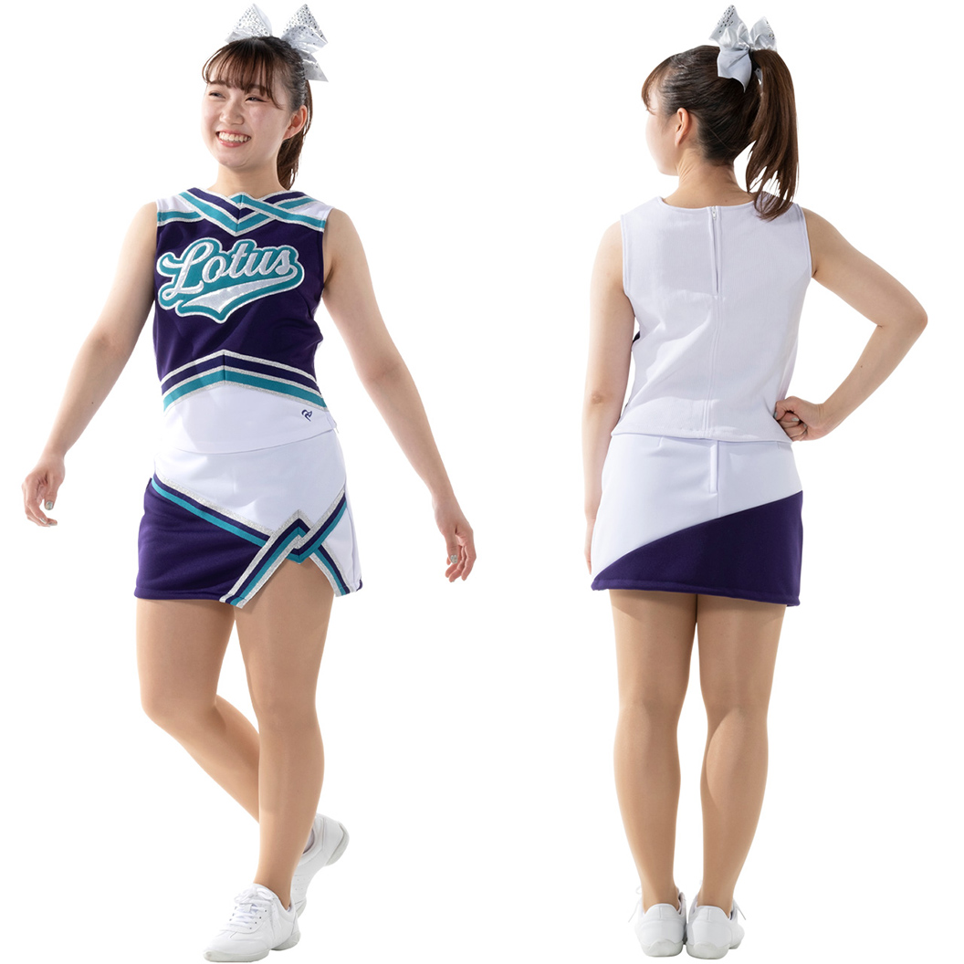 チアリーダー定番のベスト&スカートスタイルが選べるUNICHEユニフォームは、しっかりとしたジャージ生地を使用し背中はフィット感の良いリブ生地になっています。